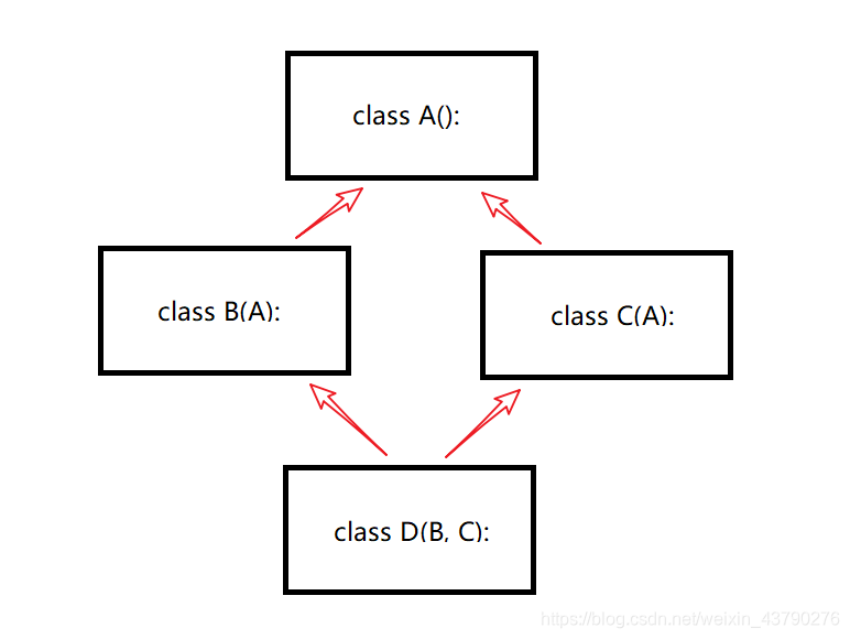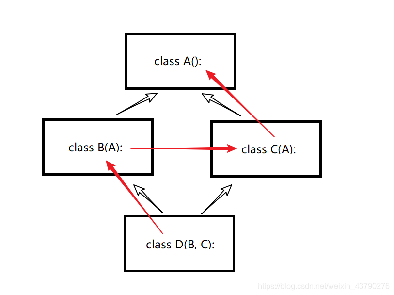 菱形继承也叫钻石继承,在这种结构中,当D类的对象使用一个属性时,首先会在D类中查找是否有该属性和方法,如果没有则会到父类中查找,如果还没有则会继续往父类的父类中查找。